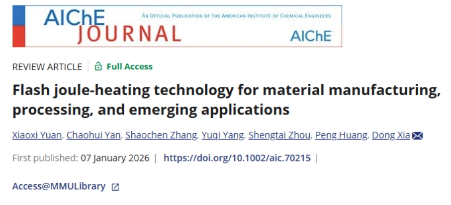 本网讯(通讯员 刘金凤)近日,公司青年教师夏东教授在化工领域国际顶级期刊《AIChE Journal》上发表题为“Flash joule-heating technology for material manufacturing, processing, and emerging applications”的综述论文。学院本科生袁晓曦为第一作者,夏东教授为通讯作者,zoty中欧体育为第一单位。