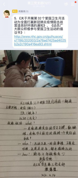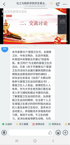 今年4月是第32个爱国卫生月。为响应习近平总书记关于新冠肺炎疫情的讲话精神,探讨如何科学应对新冠肺炎,积极参与爱国卫生运动的问题,学院本科生党支部按照学习要求,组织党员自学《关于开展第32个爱国卫生月活动为全面打赢新冠肺炎疫情阻击战营造良好环境的通知》《动员广大群众积极参与爱国卫生运动的倡议书》,围绕“改善环境共享健康”、“向不卫生不文明的饮食陋习宣战”、“和谐心态快乐生活”等重点专题进行线上学习交流,分享对文明健康、绿色环保生活方式的感悟。