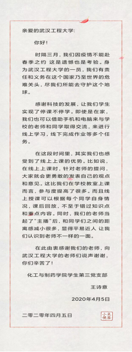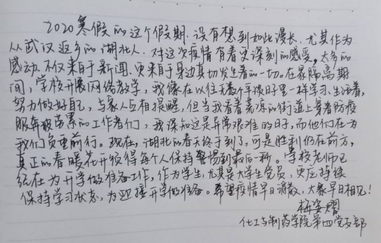 在学校推出一封信后,员工三支部立即组织支部党员通过网络,深入学习相关内容,领会有关精神。支部党员读信后深受鼓舞,展开热烈讨论,并在云端发起给学校写一封回信的活动,党员们踊跃参与,在群里晒回信、晒感想,表达自己对于学校、学院、同学的想念之情,并表示将继续做好防疫工作,在未接到返校通知时,坚持居家隔离、健康打卡、线上学习,积极配合学校的防控决策部署,争做防疫先锋,树好党员这面伟大旗帜。