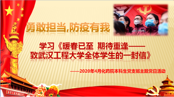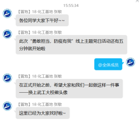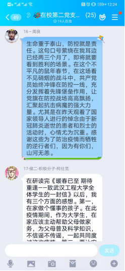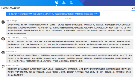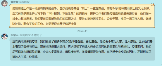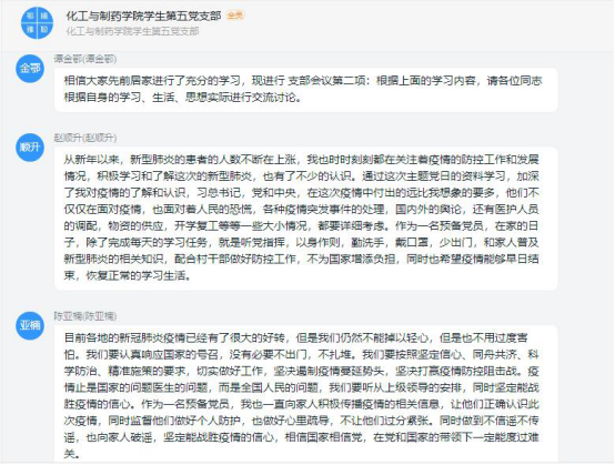 线上会议期间,各支部党员积极开展讨论,凝聚了正能量。员工党员们围绕最美逆行者的先进事例和身边亲友的抗疫事迹,结合化工、制药专业特色以及员工党员身份,谈认识、讲体会、话担当,进一步增强了责任感和使命感。本科五支部的叶令飞同学表示,将充分发挥党员先锋模范作用,自觉遵守相关防控要求,尽己所能为家乡贡献力量;本科六支部的毕业生党员赵莎同学表达了自己的抗疫决心,表示将积极响应学校号召、认真备战考研,自觉恪守员工党员本分,不负青春韶华;本科七支部的张慧双同学表示,疫情期间将尽可能做力所能及的事情,在学好专业知识的同时,不断树立正确的人生观、价值观。
