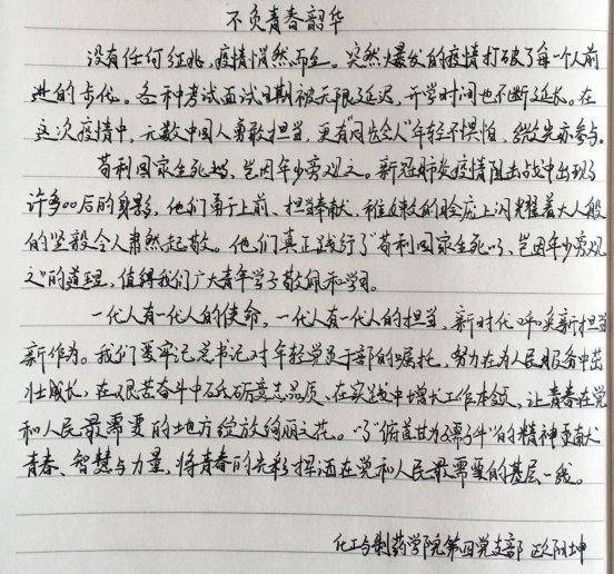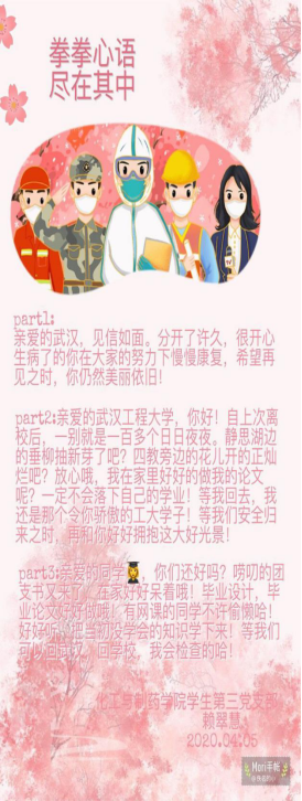 “珍惜当下,体味生命的温度;努力上进,增加生命的厚度”“愿山河无恙,致敬抗疫一线的英雄”,员工四支部19位员工党员借助笔和纸,用最常见却最温情的方式道出心声,表达青年学子身体力行、防疫有我的必胜决心,用朴实的语言表明自己居家防疫、做好线上学习的坚定态度。员工一支部、二支部在支部书记的号召下,通过QQ群,开展了“我为抗疫英雄献花”的云献花活动,支部党员全员参与,在云端寄托员工党员对抗疫英雄们的哀思和感激之情。