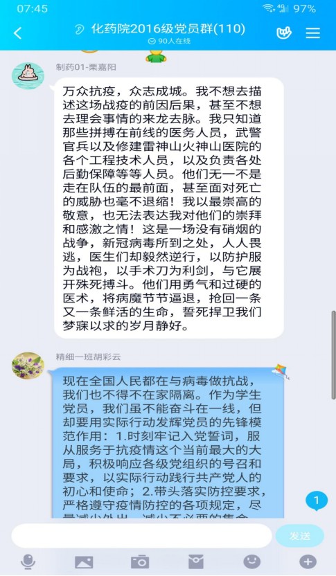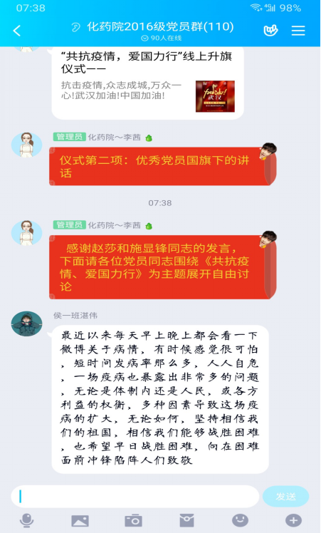 2016级在年级党员交流群开展升旗仪式,优秀党员代表员工第四党支部施显峰,员工第六党支部赵莎在观摩结束后作主题发言。全体员工党员纷纷在群里分享个人的心得体会感受。
