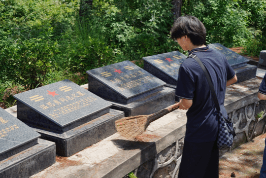 队员们拾级而上,巍峨的纪念碑树立山顶,纪念碑上“英雄烈士 永垂不朽”八个大字格外醒目,青松翠柏簇拥着烈士墓,成员们拿起扫帚,轻拂落在烈士墓碑上的枯叶,扫去纪念碑前的沙砾。忆往昔峥嵘岁月,先辈们为了新中国的国防建设,不惜奉献出年轻的生命,全体成员面对烈士纪念碑肃立默哀,以实际行动接受红色精神洗礼。