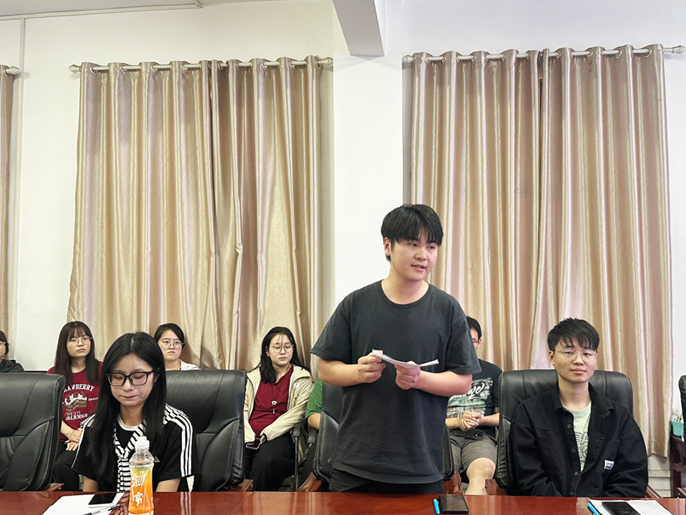 2022级研究生会副主席,研材料化工党支部书记黄琦“围绕如何做好一名员工干部”发表经验分享。黄琦从自身员工干部经历出发,提出做好一名员工干部首先要做到提升自己的思想水平和执行能力——打铁还需自身硬。其次做好一名员工干部要学会具体问题具体分析,在工作中打开思维学会举一反三。最后号召各位员工干部充分发挥自己的能力做好老师和同学之间的桥梁与纽带作用。