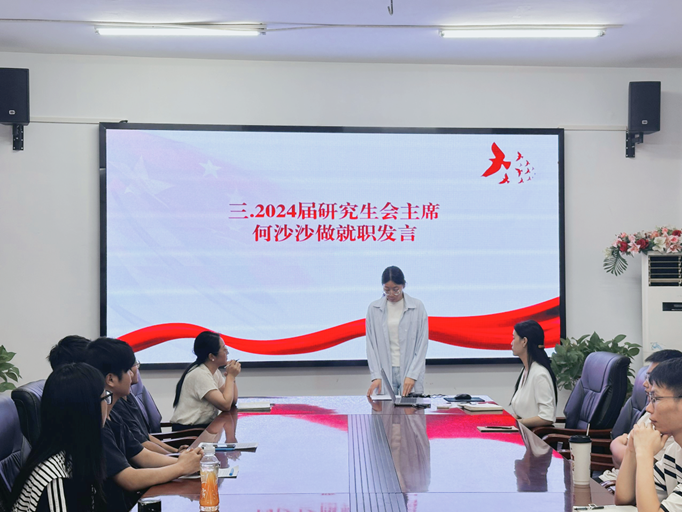 会上,上一届研究生会主席闫朋朋就上届研究生会工作进行总结并进行个人述职报告。闫朋朋就研究生会各部门职责和举办的活动向2024级研究生班委做了介绍。各部门充分发挥了研学会的桥梁作用,协助学校和学院举办了如辩论赛、运动会等丰富多彩的活动,让同学们在科研实验之余,劳逸结合。上一届研学会高质量完成员工工作给新一届研学会树立了榜样。随后,闫朋朋宣布2024届研究生会任职名单。