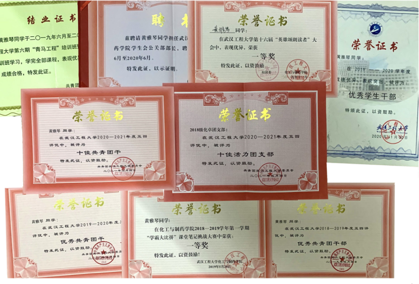 从大一起,黄雅琴连年获得“优秀员工干部”“优秀共青团干”等荣誉,2021年,十佳共青团干也收入囊中。一个人优秀不是真正的优秀,作为团支书,黄雅琴想的也从不是“一枝独秀”,而是带领班级同学一起进步,充分发挥主心骨的作用,以提升班团支部组织力、凝聚力为重点,组织开展特色鲜明主题班团会20余次,班级有10余人获得校级及以上荣誉,2018级化卓班团支部连续2年获得校“十佳活力团支部”荣誉;2021年5月,2018级化卓班团支部更是作为学校唯一代表湖北省参评全国1000强高校活力团支部,这是一个新的挑战。