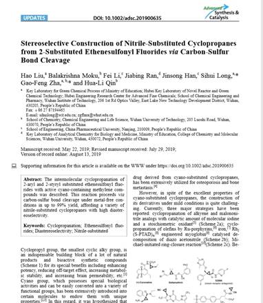 1.H. Liu, B. Moku, F. Li, J.Ran, J. Han, S. Long, G. Zha, H. Qin, Stereoselective Construction ofNitrile-Substituted Cyclopropanes from 2-Substituted Ethenesulfonyl Fluoridesvia Carbon-Sulfur Bond Cleavage,Adv. Synth. Catal.2019, 361, 4596–4601.