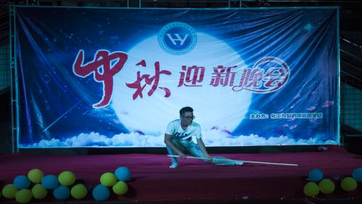 由2016级新生表演的《中国武魂》节目中,手持棍棒的少年挥舞长棍、虎虎生风,现场观众送出阵阵喝彩。