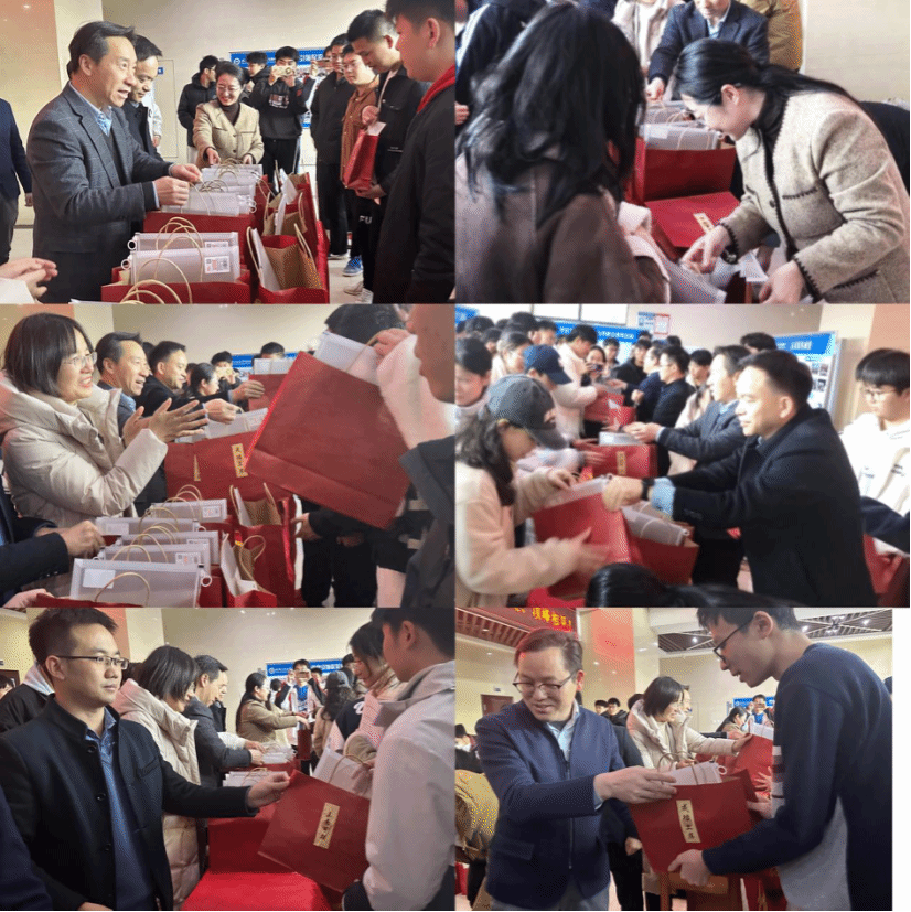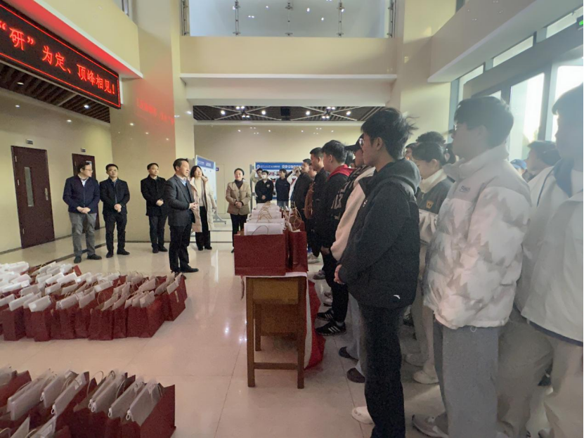 随后,杨海波等一行为同学们送上考研大礼包,红红火火的礼包袋上贴有“金榜题名”“前程似锦”“成功上岸”等祝福标签,内有考试文件袋、数学演草本、英文作文纸等实用文具,印有“未来可期”“一研为定“金榜题名”且带学院logo的祝福钥匙扣、学弟学妹给学姐学长手写的祝福明信片及寓意“笑哈哈‘的娃哈哈饮品,每一样物品都承载着学院对学子们无微不至的关怀、鼓励与祝福。同学们纷纷表示,一定会全力以赴,以饱满的精神状态迎接即将到来的考试,回报学校学院的悉心栽培和暖心关怀。