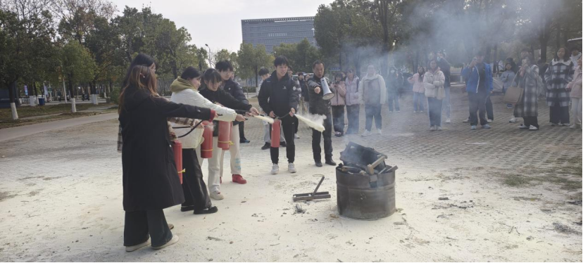 讲座结束后,同学们有序前往学校东门空旷地带进行消防演习,亲自动手使用灭火器灭火,将理论知识与实际操作相结合,更好地掌握灭火器的使用方法。