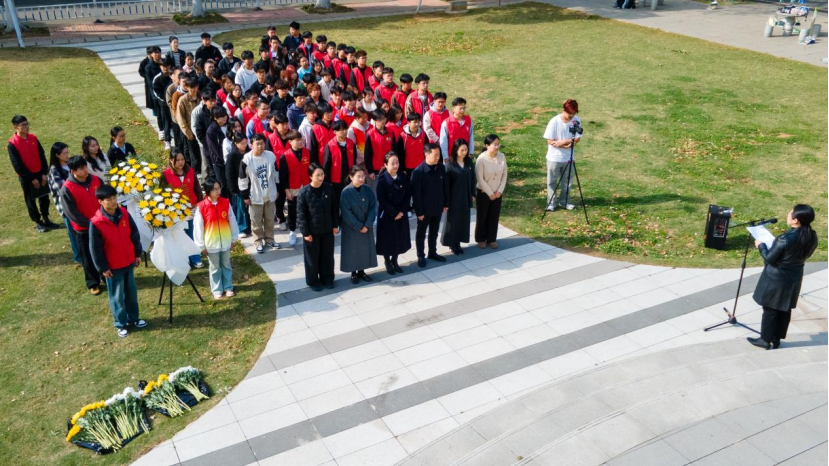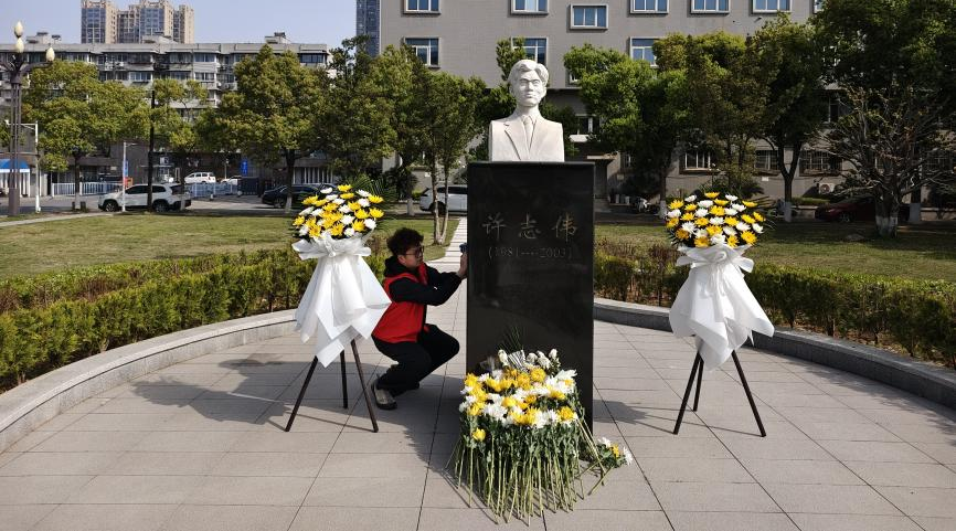 活动中,许志伟党员示范班、许志伟志愿服务队员工代表为许志伟雕像敬献花篮。全体师生代表面向许志伟雕像肃穆伫立行默哀礼。