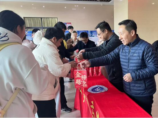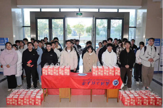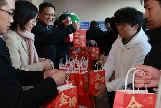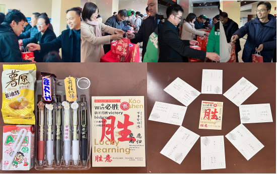 温馨氛围中,领导老师为考研学子送上定制“加油大礼包”。礼包外印“金榜题名”“前程似锦”金色字样,内藏寓意鲜明的实用好物:“考神附体”水性笔、“梦想之门”钥匙扣、学弟学妹手写祝福明信片,还有象征“旺气十足”的AD钙奶、“如愿以偿”的薯愿薯片及“能量补给”的士力架,每一件都承载着学院的殷切关怀。同学们手持礼包笑容满面,纷纷表示将带着这份温暖与鼓励全力以赴,冲刺考研不负学院期许。