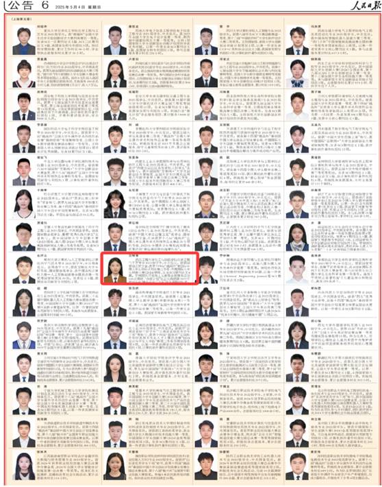 本网讯 (通讯员 汤曦) 5月4日,《人民日报》专版刊登《2023—2024学年度本专科生国家奖学金获奖员工代表名录》,展示了100名本专科生国家奖学金获奖员工代表风采。公司中欧体育2021级员工宫咪雪从全国12万本专科生国家奖学金获得者中脱颖而出,入选名录。