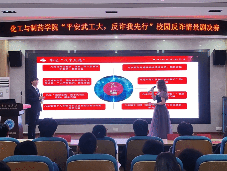 主持人讲解 “八个凡是”科普反诈技巧。辅导员汤曦、刘悦薇用生动案例向同学们讲述诈骗实例,并呼吁同学们从其中汲取经验。