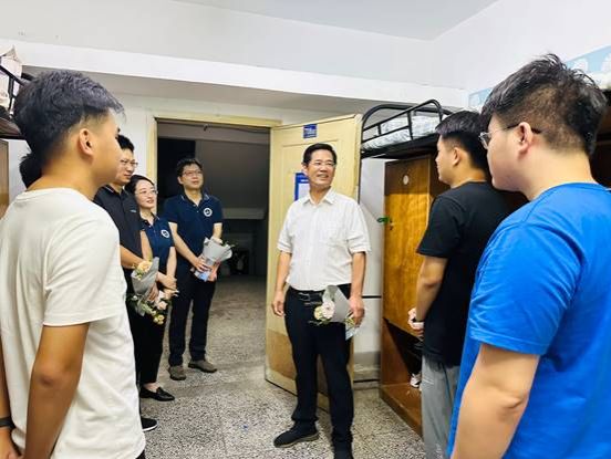 集团、学院领导分别走访新生宿舍,对新生表示欢迎,详细询问了同学们对住宿条件、生活设施、学习准备等方面的需求,并为新生详细解答相关疑问。提醒同学们要注意防范诈骗、保护好人身财物安全,有困难要及时向学院反映。鼓励大家树立积极的心态,在新的人生起点勤奋刻苦、勇敢拼搏、学有所获,以饱满的热情迎接大学新生活,争创新的佳绩。正值教师节,新生们对老师们的到来感到非常开心,并为老师们送上鲜花和祝福。