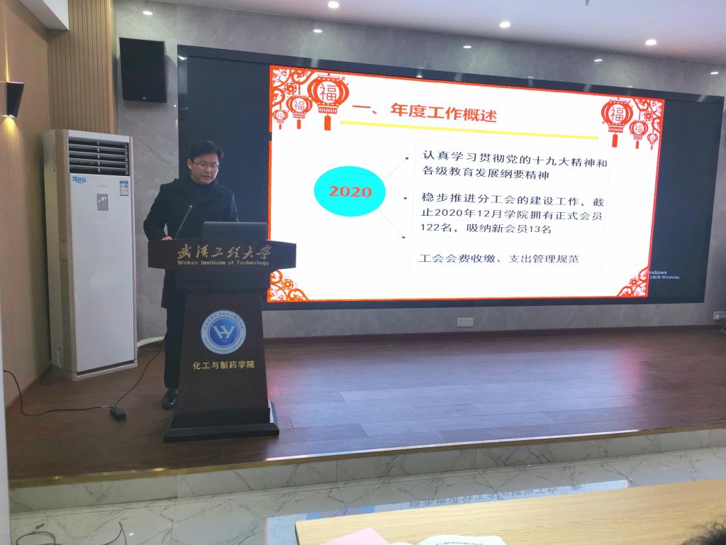 院工会主席谌伟民代表学院工会详细总结了学院工会在2020年取得的各项成绩,在过去的一年中,全体教职工认真履行基层工会职责,积极参与学校、学院防疫防汛工作,营造了和谐向上、敢闯敢拼的良好氛围,同时向大会汇报了院工会2020年的经费使用情况以及2021年工会工作打算。