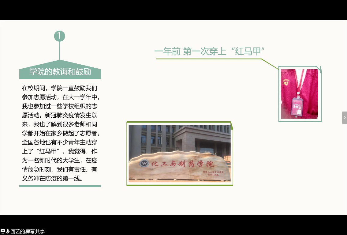 来自石油大学的潘润泽同学,则从家人的抗疫故事出发,讲述了父亲在坚持古建筑维护这一本职工作的情况下,依然选择投身抗疫志愿服务的暖心小事,让大家真切感受到疫情之中,每一个人都尽己所能,保护身边人,为抗疫努力着。