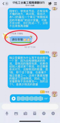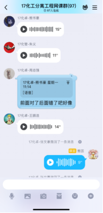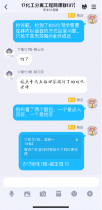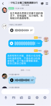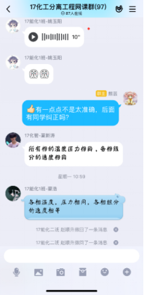第一次在线课程快结束时,有员工反馈,虽然互动的形式很有意思,但效率不高,因为优学院app的聊天功能受限,不能发语音;每门课程的班级都有一个群聊,且群聊名称都一样,并不知道分离工程的课程群聊是哪个。在接纳了同学们的意见后,决定网上教学不完全依赖优学院平台,发起投票,由员工决定互动环节在QQ群内进行还是在钉钉上进行,多数员工选择了QQ平台,于是建立了QQ网课群,采用优学院+QQ群双管齐下的模式,开展网络教学。