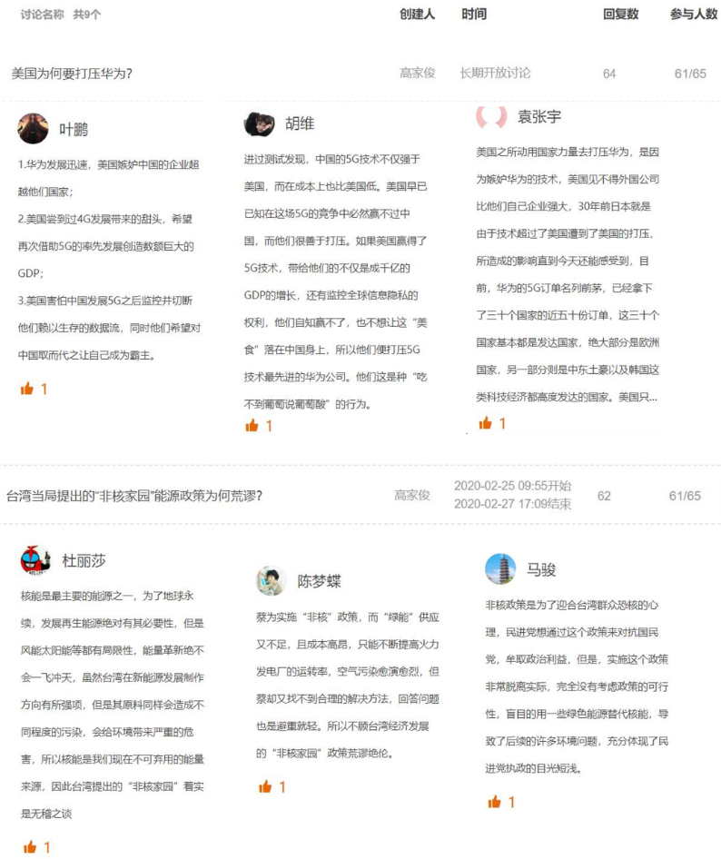 在第一周的教学活动中,已开设《荒谬的非核家园》和《5G的博弈》等两个专题的“课程思政”教学。《荒谬的非核家园》的教学采用教师自拍视频的方式。以过程系统分析与综合的专业知识为切入点,教师通过图片展示的形式,逐步解读台湾当局“非核家园”能源政策的荒谬性,以突显台湾所谓“民主制度”的弊端,并以本次疫情的举国大动员为例,彰显出中国特色社会主义制度的优越性。