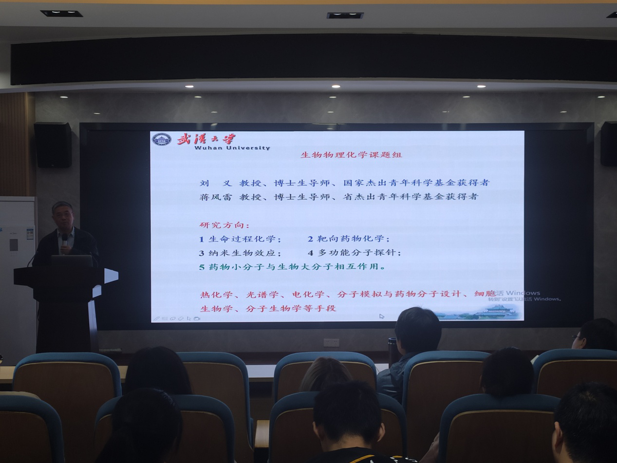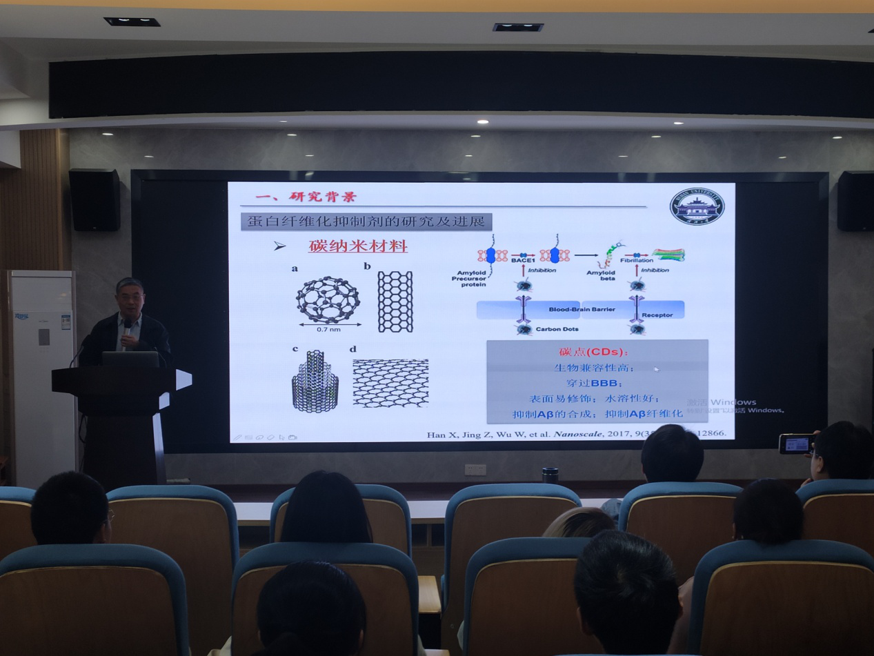 刘义教授首先简述了人类胰岛素(HI)与阿尔茨海默氏病(Alzheimer)之间的联系及研究HI蛋白纤维化过程及抑制剂的重要意义。刘义教授通过动力学及热力学分析方法获得了纤维生长规律及纤维诱导生长机制。刘义教授接下来探索并获得了碳点(CDs)对HI静电相互作用的抑制机制,然后筛选出了抑制活性最好的10-1 CDs。然后通过分子动力学模拟,系统研究了CDs与HI的结合,发现主要作用位点为His2和His10残基处,并通过分析作用力类型和大小,证实了CDs羧基增加,静电作用增强。基于上面的研究,通过CDs表面改性,发现了CDs表面羧基的空间位置能够影响其抑制活性。除此之外,刘义教授发现并提出了在CDs抑制HI纤维化的同时还具有抗氧化活性的生物应用。报告结束后,在场师生和刘教授做了探讨和交流。