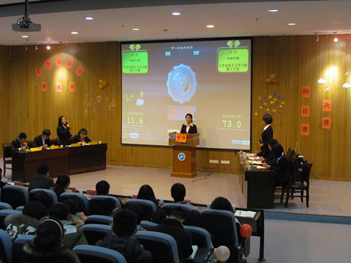 经过初赛、复赛、半决赛的角逐,来自2014级化工与制药类1班的千机辩队和2014级化工与制药类6班的First Team队脱颖而出,晋级决赛。决赛辩题为“大学功利主义学习观的利弊”,由“开篇立论”、“攻辩”、“小结”、“自由辩论”、“总结陈词”五个环节组成。正方千机辩队阐述了功利主义代表人物英国哲学家经济学家边沁的观点,指出功利主义的目的是追求“最大幸福”,功利主义学习观有助于老员工更好的学习掌握专业知识技能,反方First Team队列举生作弊、逃课、盲目考证等现象,论述了功利主义学习观的危害性。整个过程双方引经据典、旁征博引,争锋相对,气氛热烈,观众不时爆发出阵阵掌声。总结陈词阶段,双方四辩针对对方逻辑上的漏洞回击,力争为赢得比赛做最后的努力。