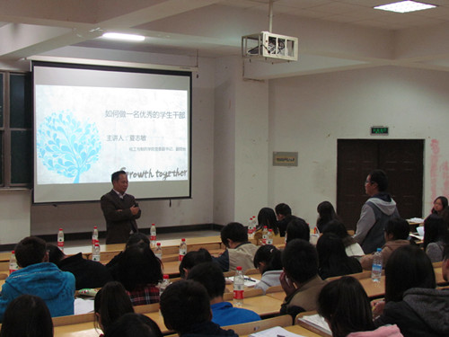 夏志敏老师指出员工干部是连接学院和员工之间的桥梁纽带,员工干部在建设优良学风、丰富员工第二课堂、繁荣校园文化等方面起到积极作用。他要求员工干部正确处理好学习和工作的关系,加强自我教育、自我管理和自我服务。他建议员工干部在员工工作中要不断提高自己的写作能力、表达能力、分析问题和解决问题的能力以及组织协调能力,培养具备良好的政治素质、业务素质和心理素质。夏老师又结合自己员工时代员工干部经验,鼓励大家勇于尝试,在员工工作岗位上不断锻炼和提高自己的综合素质和能力。最后,夏老师回答了部分同学的提问。