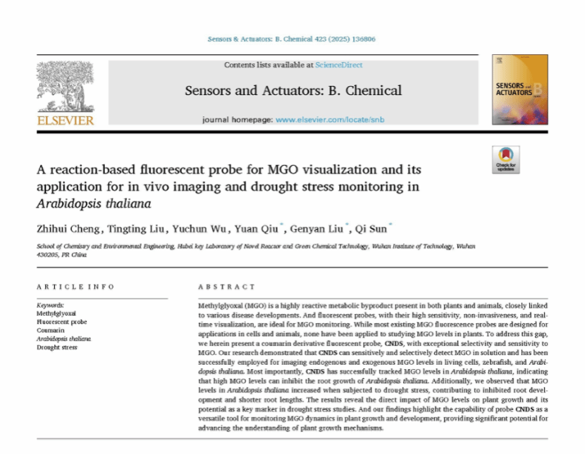 本网讯(通讯员 徐志强)近日,中欧体育化学工程与工艺专业2021级本科生程智慧以第一作者在国际知名期刊Sensors and Actuators: B. Chemical(中科院一区TOP期刊,影响因子8.0)发表了题为《A reaction-based fluorescent probe for MGO visualization and its application for in vivo imaging and drought stress monitoring in Arabidopsis thaliana》的学术论文。zoty中欧体育为唯一署名单位,中欧体育药物先导与功能分子团队刘根炎教授与孙琦副教授为论文共同通讯作者。