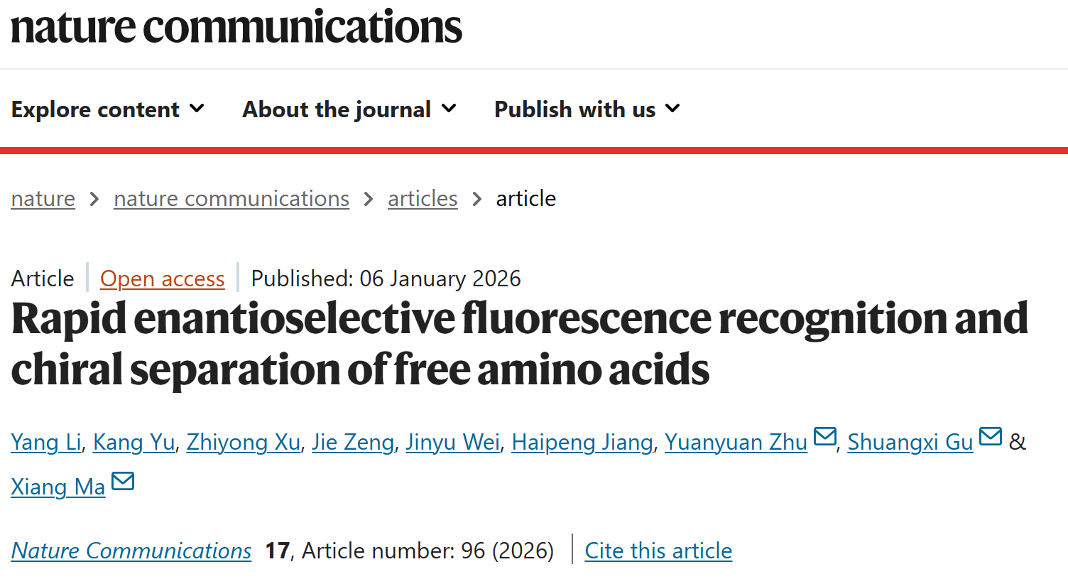 本网讯(通讯员 杨公明 龙姣)近日,公司古双喜教授研究团队在国际著名期刊《Nature Communications》上发表题为“Rapid enantioselective fluorescence recognition and chiral separation of free amino acids”的研究论文。zoty中欧体育为第一单位,中欧体育李扬副教授、2024届硕士毕业生余康、2023级博士生许志勇为论文共同第一作者,化学与环境工程学院朱园园教授、中欧体育古双喜教授和华东理工大学马骧教授为论文共同通讯作者。
