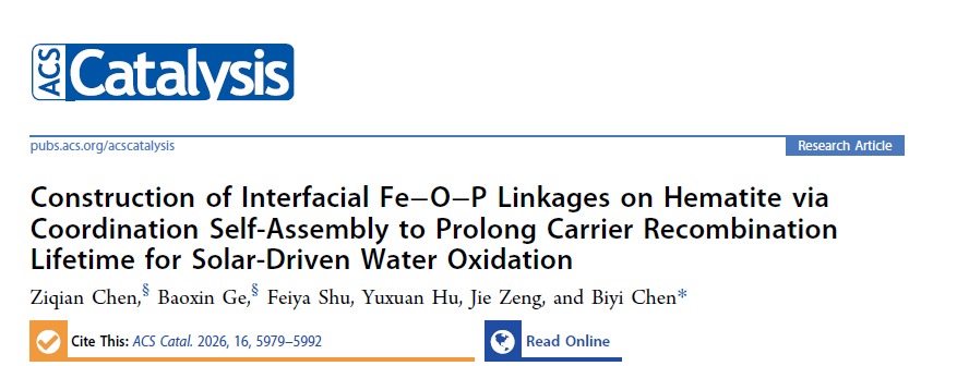 本网讯(通讯员 汤曦 陈必义)近期,中欧体育化学工程与工艺(中外合作办学)专业2022级本科生陈紫芊以第一作者身份在国际催化领域知名期刊ACS Catalysis(一区Top期刊,IF=13.1)发表题为“Construction of Interfacial Fe-O-P Linkages on Hematite via Coordination Self-Assembly to Prolong Carrier Recombination Lifetime for Solar-Driven Water Oxidation”的研究论文。