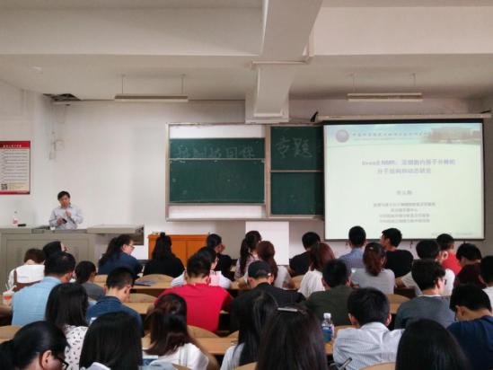 李从刚教授简单地介绍了课题背景后,先向同学们展示了复杂环境下蛋白质NMR的研究,并指出细胞内微环境效应的NMR的研究策略:体外模拟和细胞实验,并围绕“拥挤与限域环境下钙调蛋白的结构和功能”,向同学们介绍了拥挤与限域环境产生的影响。李教授还分别讲解了细胞内钙调蛋白活化机制研究和细胞内化学修饰蛋白研究,并介绍了活细胞内核酸结构的定量测量。
