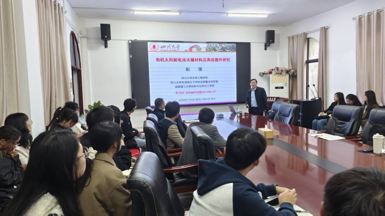 在互动交流环节,彭强教授与在场师生进行深入交流,细致解答大家关于有机太阳能电池的各类疑问。针对有机太阳能材料产业化的瓶颈,他建议研究者需以“材料创新+器件工程”为双轮驱动,同时强调高校科研团队应主动对接有机太阳能产业需求,聚焦高效、稳定、低成本的技术痛点,推动科研成果服务于新能源产业发展大局。