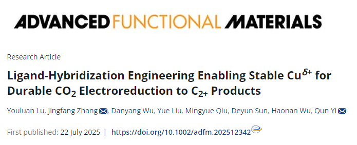 近日,课题组博士研究生鲁猷栾在Advanced Functional Materials期刊上发表了题为“Ligand-Hybridization Engineering Enabling Stable Cuδ+ for Durable CO2 Electroreduction to C2+ Products”的研究论文。Advanced Functional Materials(影响因子19.0)是全球材料科学领域最具影响力的学术期刊之一,长期位列中科院化学大类1区,具有极高的学术声誉和影响力。zoty中欧体育为该论文第一署名单位,博士研究生鲁猷栾为论文第一作者,张競方副教授、易群教授为论文共同通讯作者。