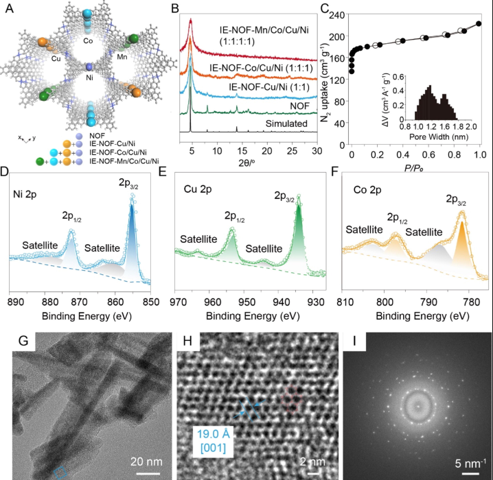 在这项研究中,研究团队通过在基于Ni2+和2,3,6,7,10,11-六氨基三苯基六盐酸盐的MOF(NOF)的晶格中引入Cu2+、Co2+、Mn2+等金属离子,成功制备了具有熵增特性的NOF(IE-NOF)。这种IE-NOF-Mn/Co/Cu/Ni(1:1:1:1)的电导率是原始NOF的30倍。通过密度泛函理论(DFT)计算表明,IE-NOF-Mn/Co/Cu/Ni(1:1:1:1)能够将小极化子分解为高度离域的电子,降低了Na-N之间的相互作用,从而促进了Na+的扩散,与NOF相比具有更低的能量势垒(0.1 vs 0.5 eV)。作为负极材料,IE-NOF-Mn/Co/Cu/Ni(1:1:1:1)展现了高比容量(100 mA g-1时为551 mAh g-1)和优异的倍率性能(5 A g-1时为303.1 mAh g-1)。这种基于熵增策略促进极化子崩溃以增强电荷转移的方法,为快速充电电池的发展提供了有益的启示。