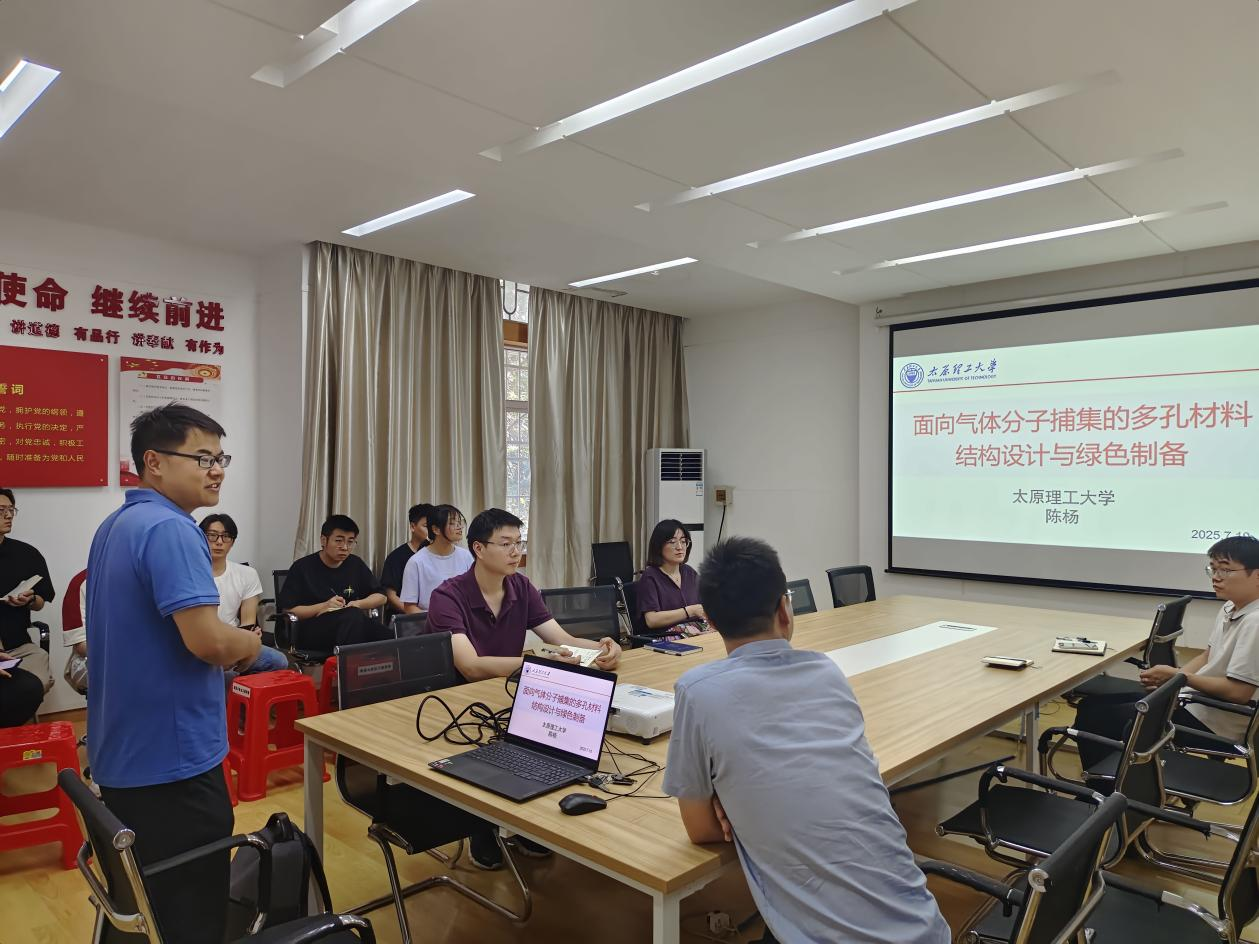 应课题组邀请,太原理工大学陈杨研究员7月10日下午莅临zoty中欧体育中欧体育进行学术交流。陈杨老师作了题为《面向气体分子捕集的多孔材料结构设计与绿色制备》的学术报告,系统介绍了面向不同应用场景的多孔金属有机骨架(MOFs)材料的定向设计思路及其在氨吸附、轻烃分离和CO₂吸附等方面的研究进展,并展示了其在连续生产与公斤级合成方面的工艺成果。报告期间,陈杨老师还与参会师生就新型吸附剂在能源与环境气体分离领域的开发与应用进行了深入探讨与交流。